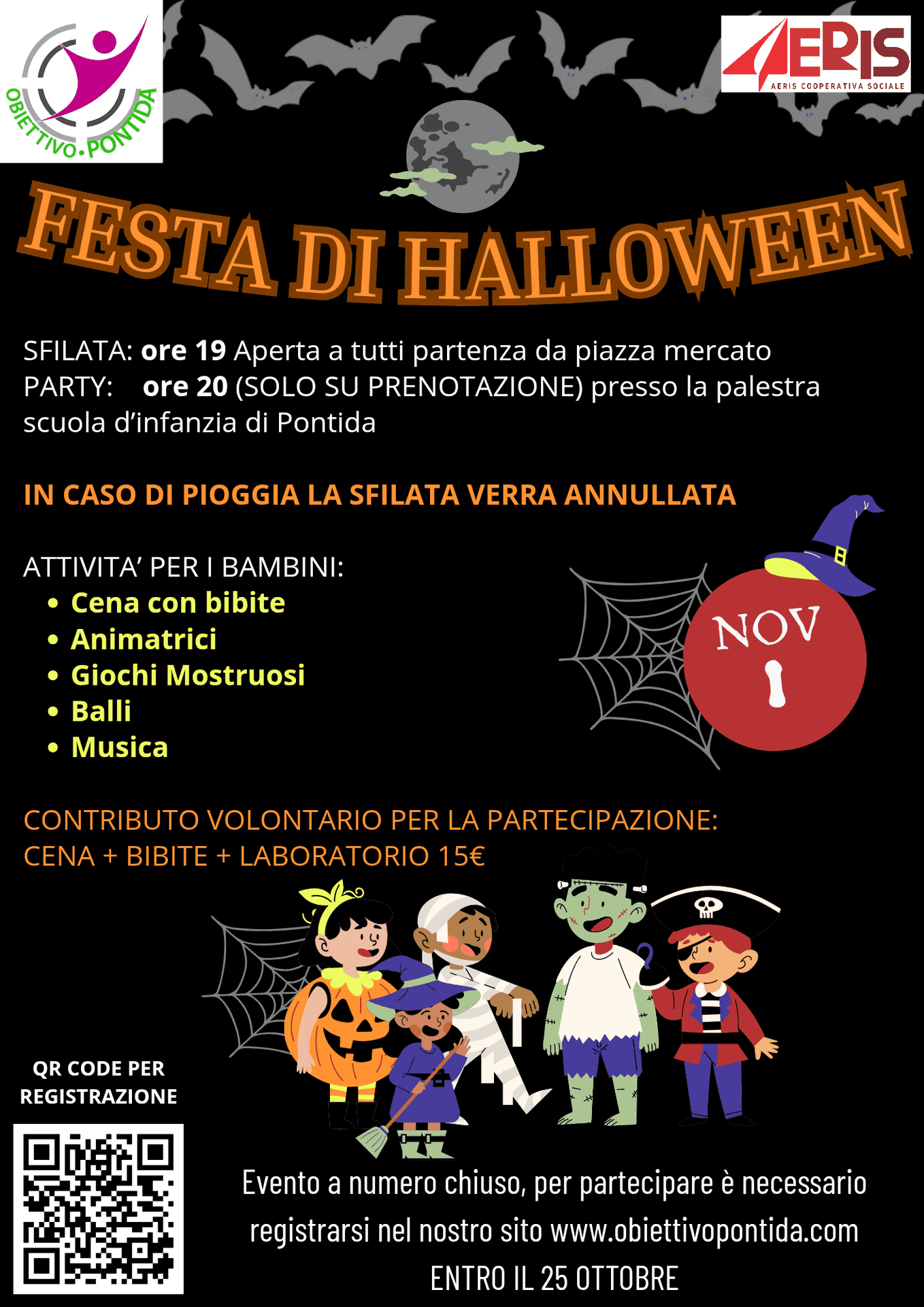 👻 Preparati per la Notte più Spaventosa dell'Anno a Pontida! 🎃 Il 1° Novembre, Pontida si trasforma per una Festa di Halloween da brivido organizzata da Obiettivo Pontida e Aeris Cooperativa Sociale! PROGRAMMA DELLA PAURA: ⏰ 19:00: Partenza dalla piazza mercato per la Sfilata di Halloween più mostruosa che ci sia! (Aperta a tutti!) 🍽️ 20:00: Mega Halloween Party nella palestra della scuola d'infanzia! Ti aspettano: cena, bibite, animatrici, giochi, balli scatenati e musica! IMPORTANTE: Il Party è a numero chiuso! Contributo volontario (Cena + Bibite + Laboratorio): 15€ Non perdere l'occasione di far divertire i tuoi bambini con giochi "mostruosi"! REGISTRATI SUBITO! Clicca il link Scadenza iscrizioni: 25 Ottobre!